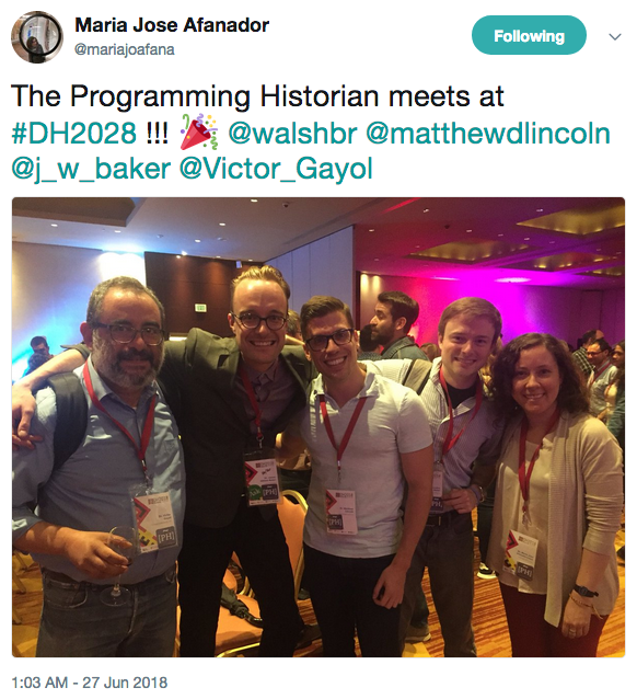 PH Blog The Programming Historian blog is our space to share news about the project, ideas for how you might use technology in your work, and exciting examples of the Programming Historian applied in the real world. Subscribe to the RSS feed for new blog posts. November 9, 2018 Zoe LeBlanc Joins the Project Brandon Walsh Zoe LeBlanc has joined the Programming Historian October 6, 2018 Convocatoria para editores de contenidos de The Programming Historian en español Jennifer Isasi Desde su lanzamiento en marzo de 2017, el equipo de The Programming Historian en español, junto con su red de colaboradores, ha traducido 38 tutoriales del inglés al español y ha iniciado el proceso para publicar lecciones originales en español. Continuando con nuestro compromiso con la diversidad lingüística y de hacer llegar estos tutoriales a un mayor número de usuarios, The Programming Historian está buscando un nuevo miembro para contribuir al equipo de editores de contenidos en español. El/la editor/a trabajará para hacer accesibles los tutoriales de PH al público hispanohablante, facilitará los procesos de escritura y traducción de tutoriales y actuará como editor de los mismos. De igual forma, apoyará la continuación de estrategias para construir una comunidad que ayude a aumentar el acceso y la colaboración de PH en el mundo hispanoparlante. August 8, 2018 Writing Workshop Report Bogotá, Colombia Adam Crymble and Maria José Afanador-Llach Group Photograph of workshop participants in Bogota, 2018. July 13, 2018 Programming Historian French-speaking initiative Anna-Maria Sichani Marie Puren and Sofia Papastamkou have joined the Programming Historian July 9, 2018 The Programming Historian in DH2018 Maria José Afanador-Llach and James Baker Members of the Programming Historian project team at DH2018 June 3, 2018 The Seven More Lessons No One's Yet Written (but need writing) Adam Crymble The Programming Historian Needs YOU...to help historians digitally analyse! May 24, 2018 Anna-Maria Sichani joins Project Team Antonio Rojas Castro Anna-Maria Sichani has joined the Programming Historian ← 12 / 18 →