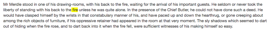 Apart from aiding literary study, the corpus stylistic analysis of historical fiction can reveal insights into the social context of the texts more widely. In this post, we’ll discuss the so-called ‘fireplace pose’ in 19th century fiction that has been identified in literature and other cultural material from the time (for example paintings; see Korte 1997: 212). In CLiC it is possible, for example, to 1) trace textual patterns which describe how fictional characters sit or stand in front of the fire or look at it and 2) compare the patterns found in Dickens with those of other authors.
